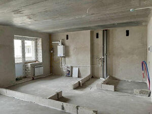 В квартире уже выполнена черновая отделка. Есть стяжка пола, штукатурка стен, электричество заведено в квартиру, разведено отопление, установлены радиаторы биметалл. Высота потолка 2,7 м.
